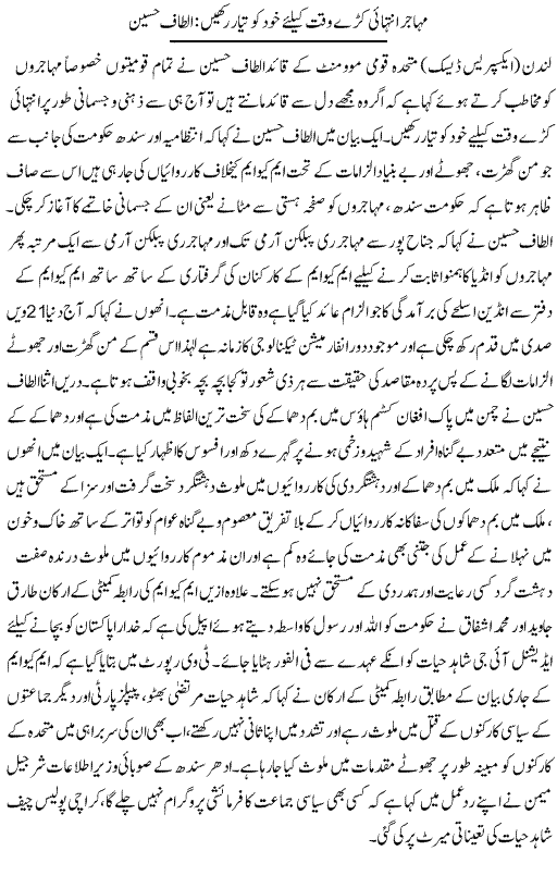 Mohajir Enthai Karay Waqat k Liya Hud Koo Tayar Rakhya.Altaf Hussain